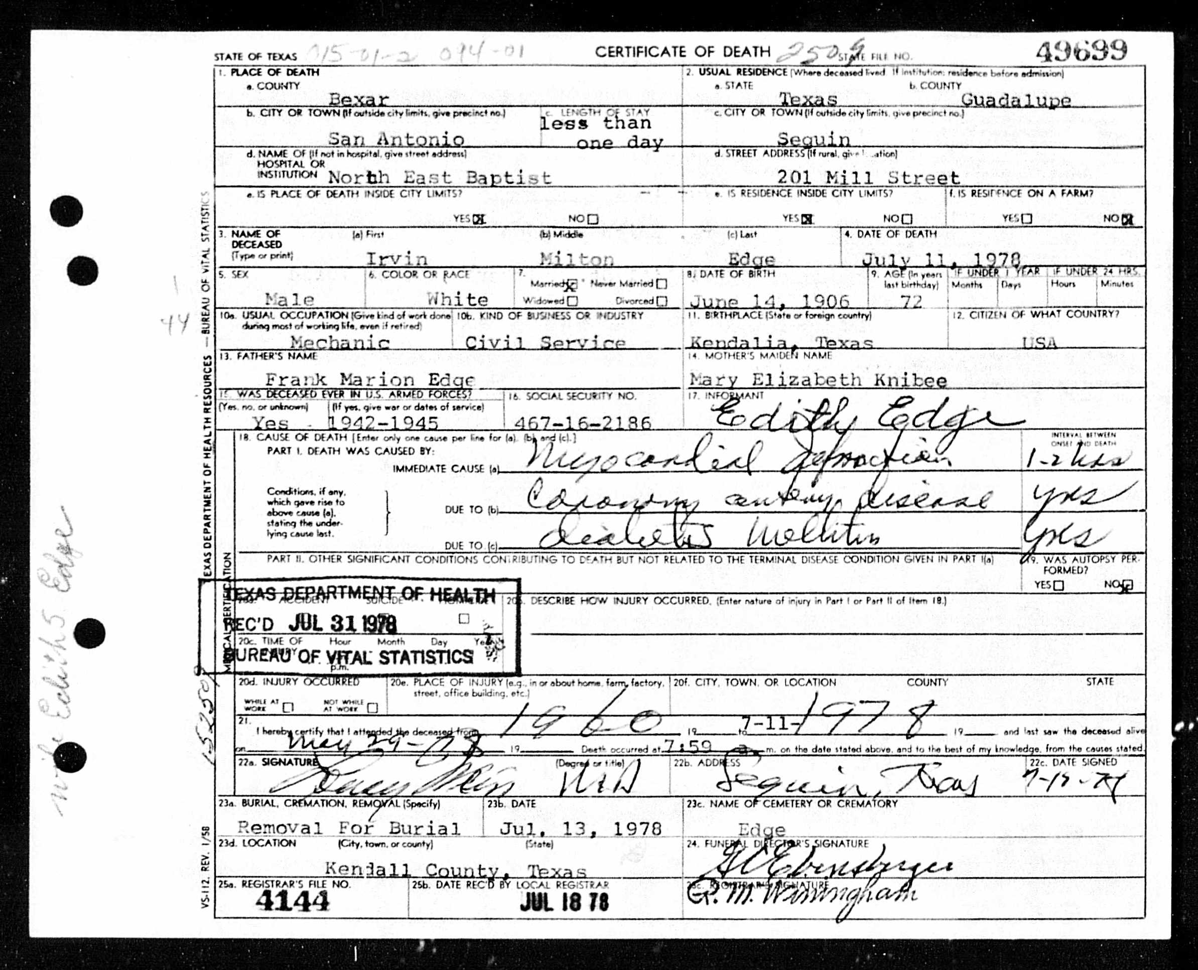Irvin Milton Edge was born on 14 Jun 1906 in Kendalia, Kendall, Texas and died on 11 Jul 1978 in San Antonio, Bexar, Texas. He was the son of Frank Edge and Mary Elizabeth Knibbe Edge.