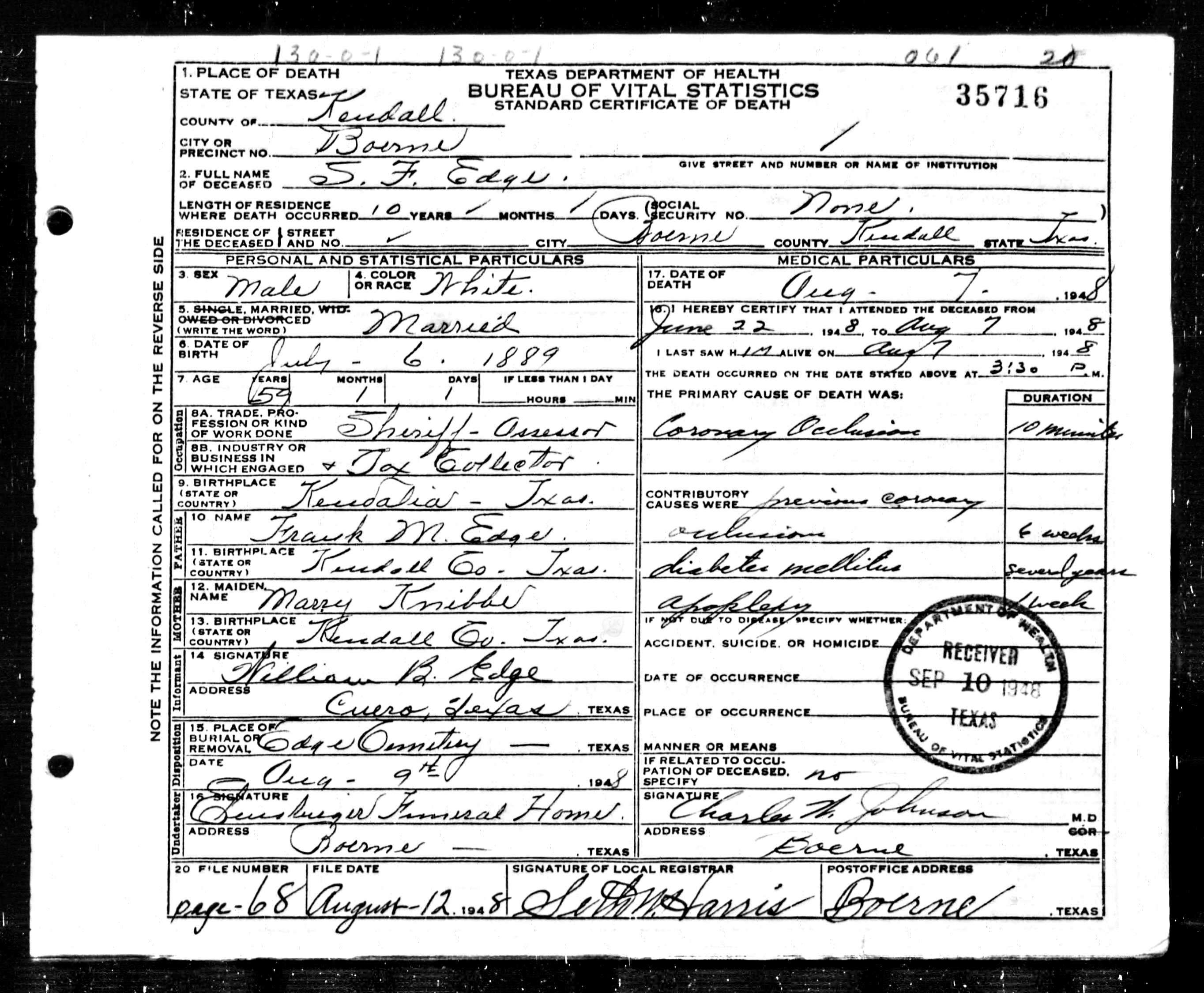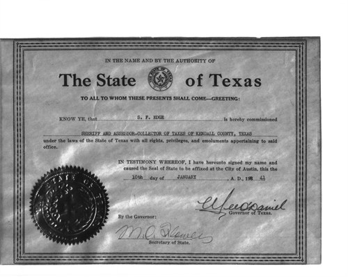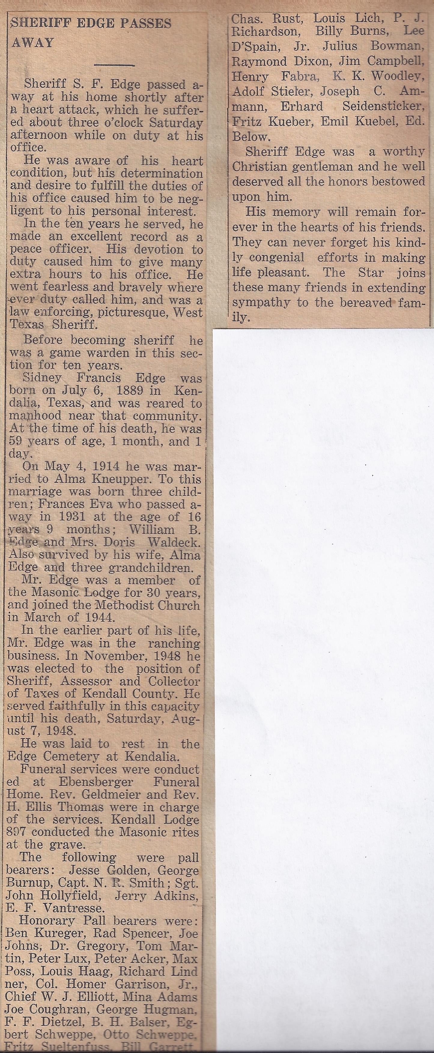 Sidney Francis Edge was born 6 Jul 1889 at Kendalia, Kendall, Texas and died 7 Aug 1948 in Boerne, Kendall, Texas while serving as Kendall County Sheriff. He was the son of Frank Edge and Mary Elizabeth Knibbe Edge.