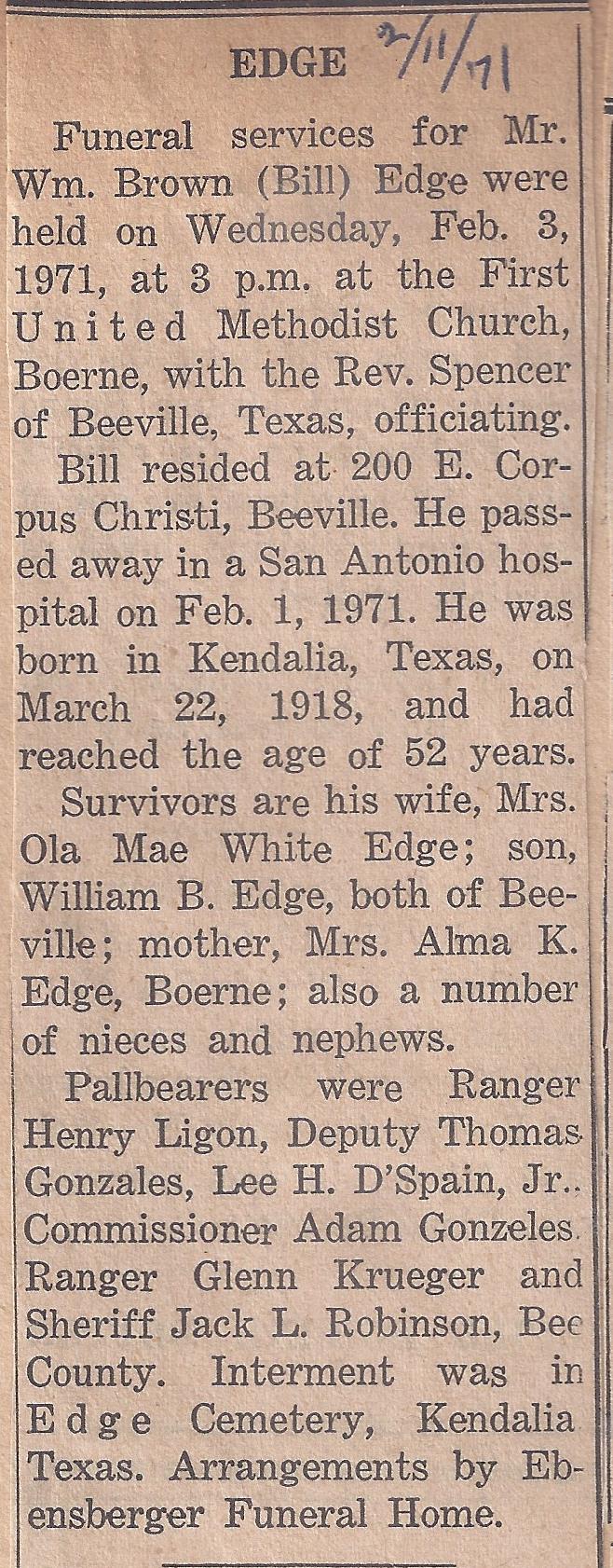 William Brown Edge was born 22 Mar 1918 in Kendalia, Kendall, Texas and died 1 Feb 1971 in San Antonio, Bexar, Texas. He was the son of Sidney Edge and Alma Kneupper Edge.