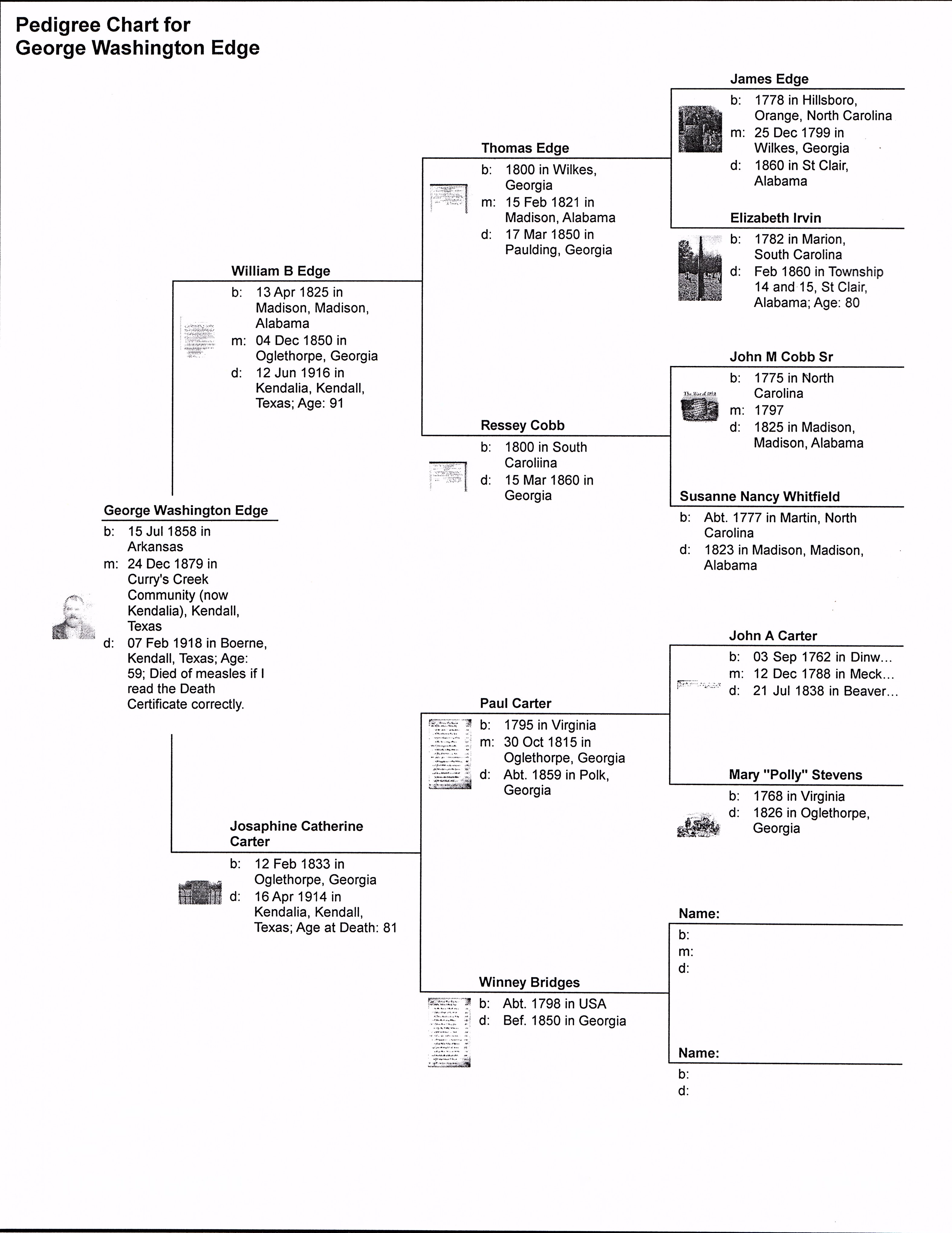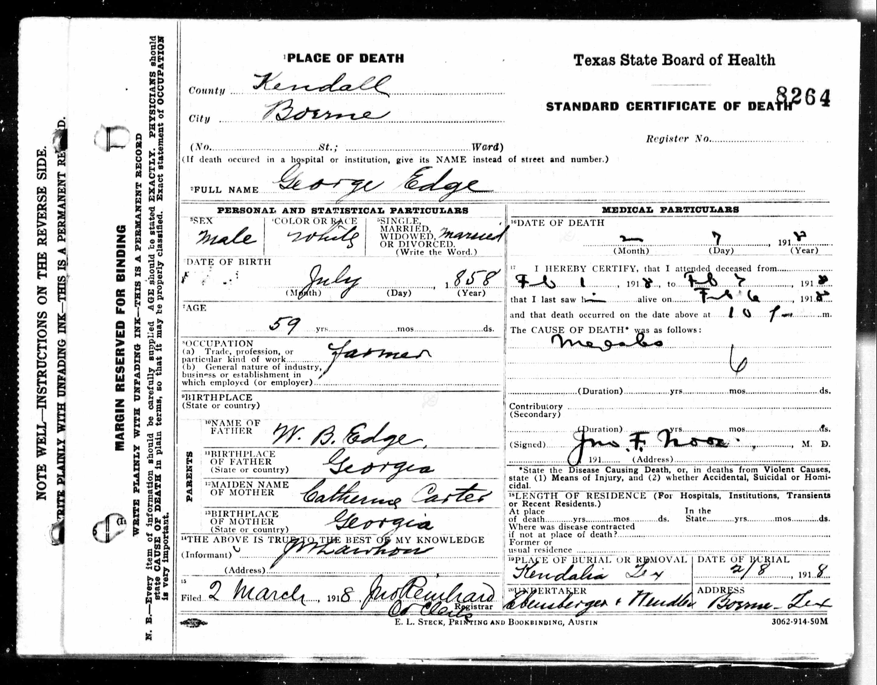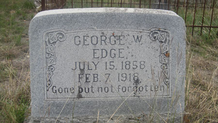 George Washington Edge was born in Arkansas on 15 Jul 1858 and died in Boerne, Kendall, Texas on 7 Feb 1918. He was the son of William B Edge and Josaphine Catherine Carter Edge.