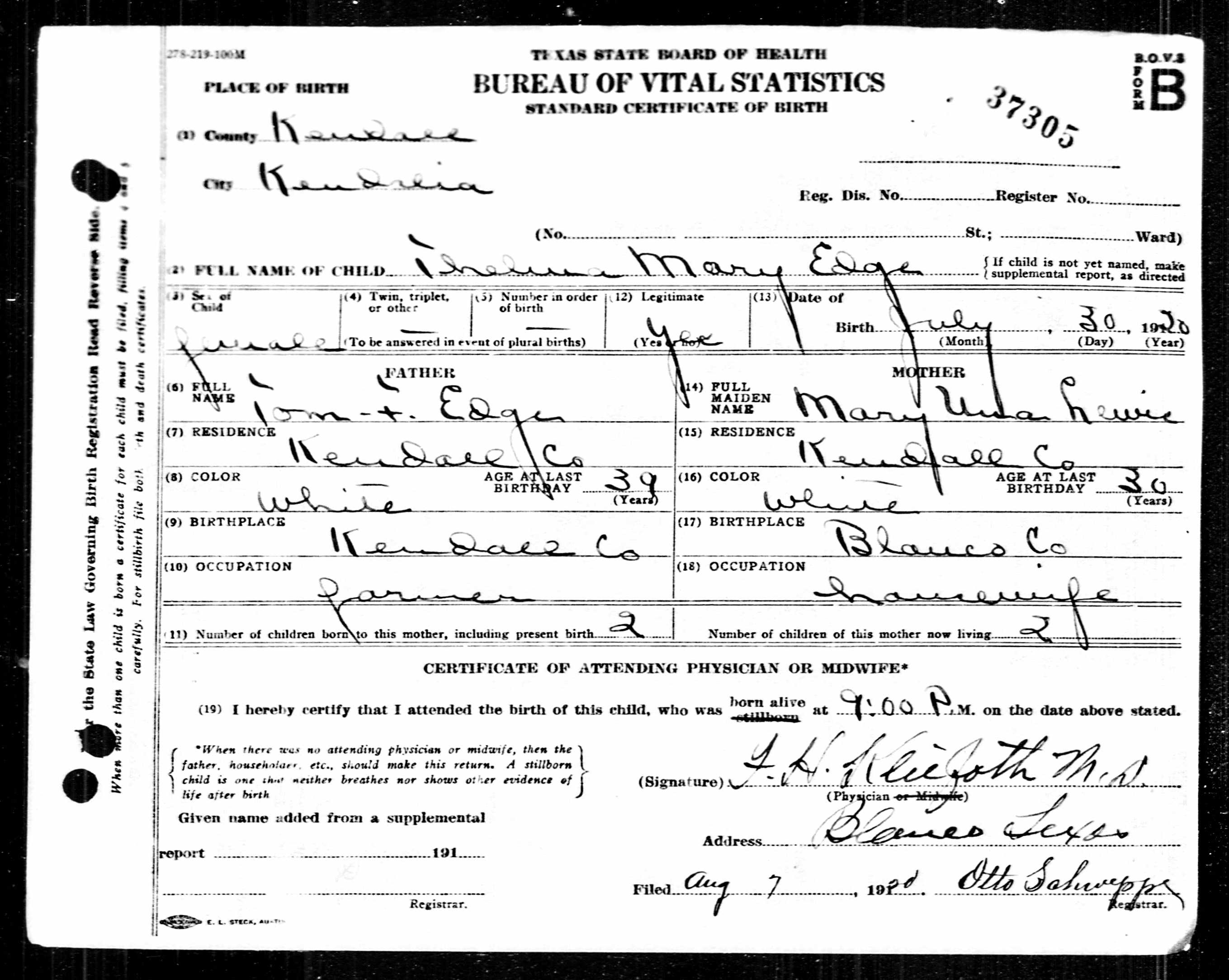 Thelma Mary Edge was born 30 Jul 1920 in Kendalia, Kendall, Texas and died 1 Jan 2020. Mary was the daughter of Thomas Franklin Edge and Una Lewis Edge.