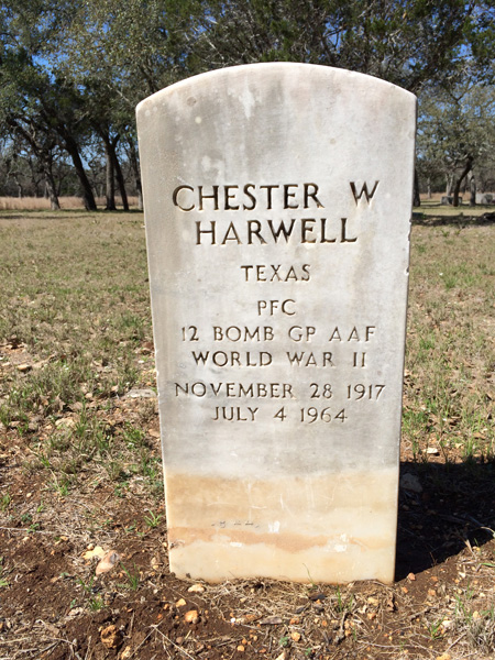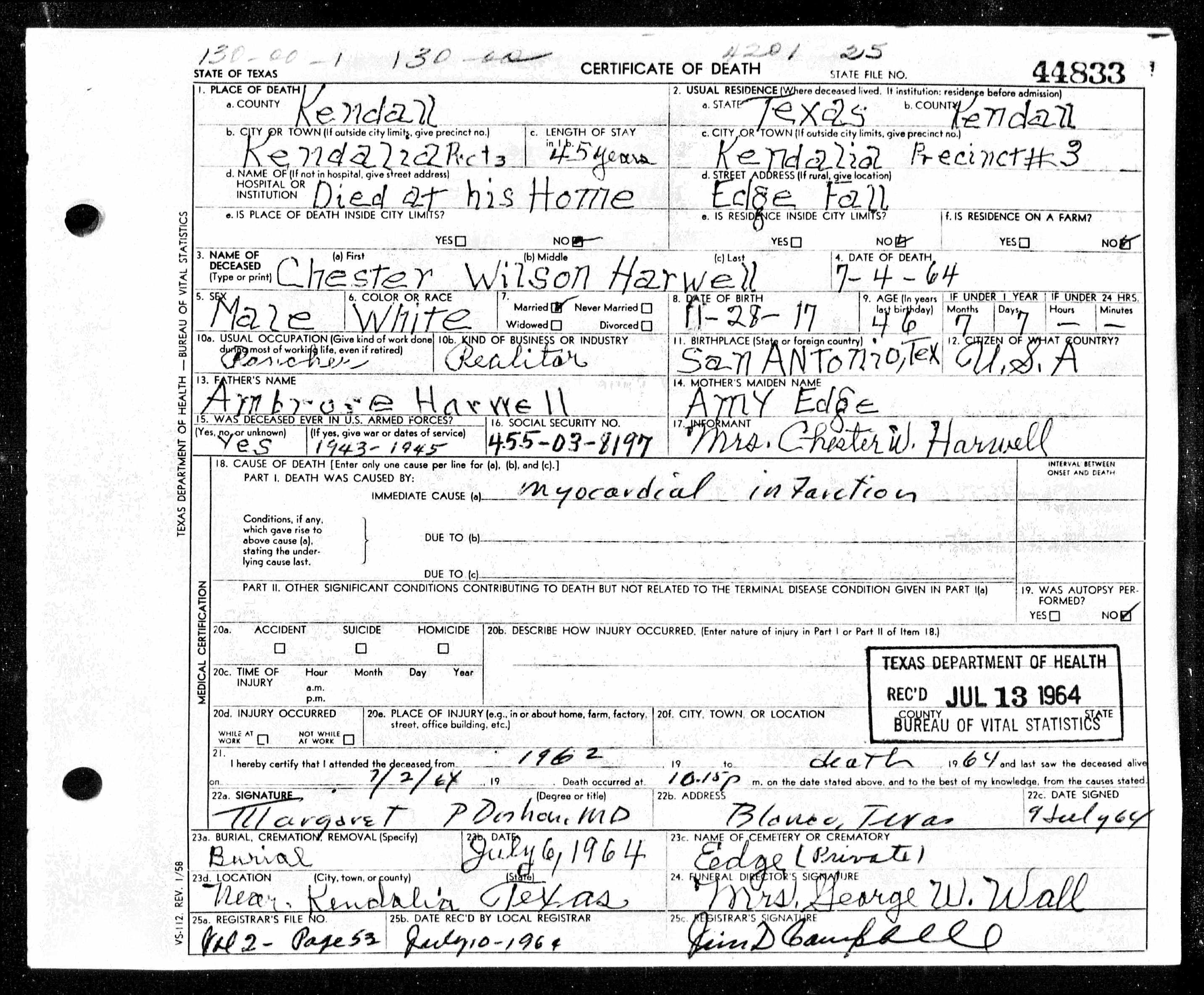 Chester Wilson Harwell was born in San Antonio, Bexar, Texas on 28 Nov 1917 and died near Kendalia, Kendall, Texas on 4 Jul 1964. He was the son of Ambrose Andrew Harwell and Amy Emily Edge Harwell.