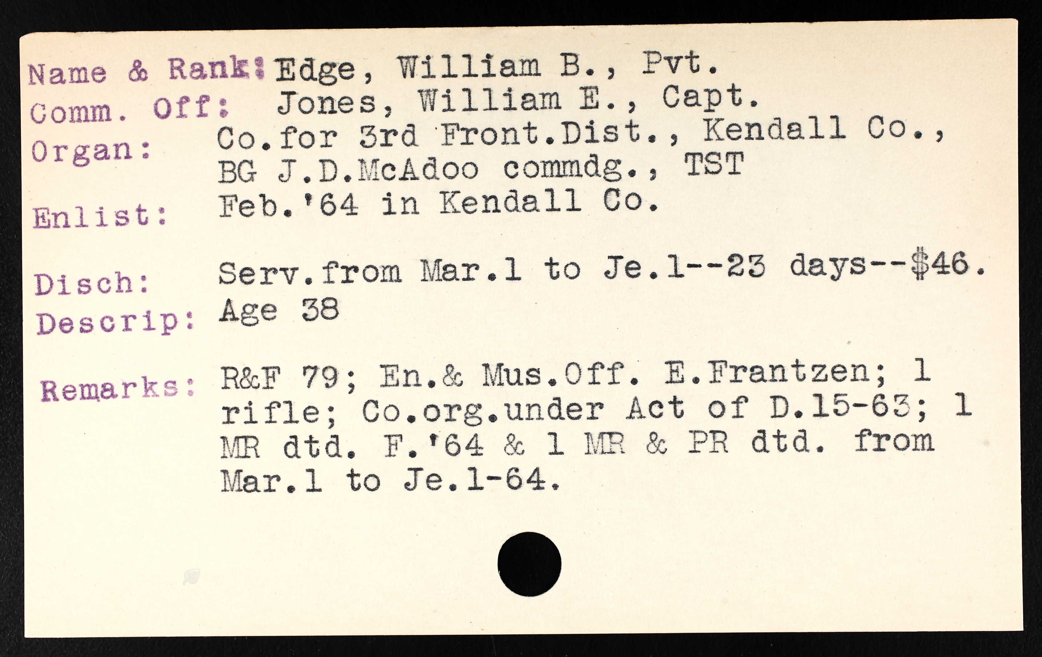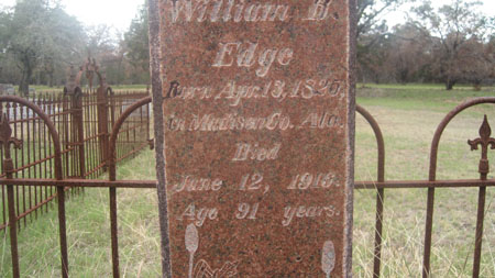 William B Edge was born in Madison County, Alabama on 13 Apr 1825 and died near Kendalia, Kendall, Texas on 12 Jun 1916. He was the son of Thomas Edge and Ressey Williams Cobb Edge.