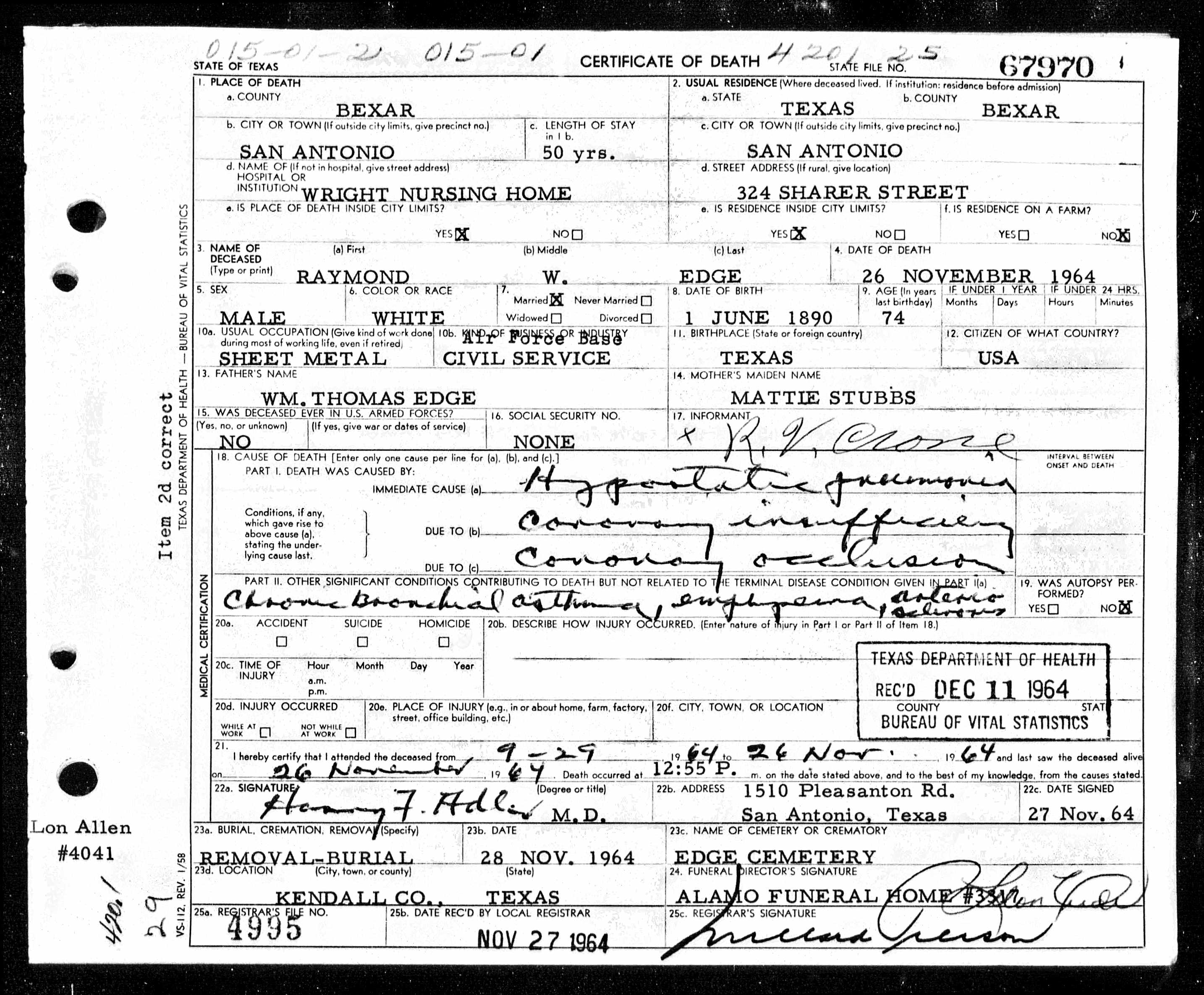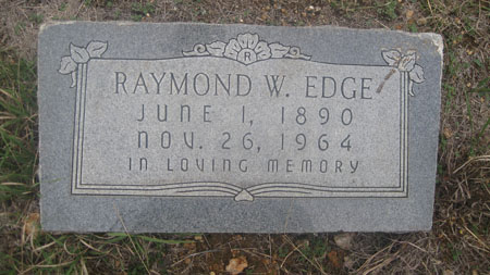 Raymond William Edge was born on 1 Jun 1890 near Kendalia, Kendall, Texas and died 26 Nov 1964 in San Antonio, Bexar, Texas.  He was the son of William T Edge and Martha Beth "Mattie" Stubbs Edge.