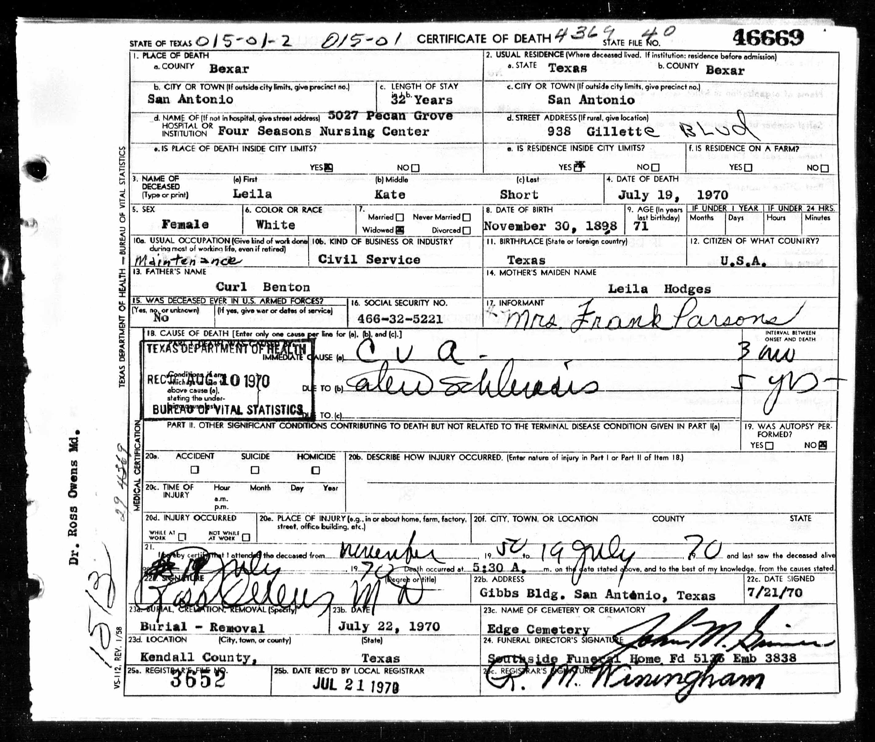 Leila Kate Benton was born in Wilson County, Texas on 30 Nov 1898 and died in San Antonio, Bexar, Texas on 19 Jul 1970. She was the daughter of John Benton and Malissa Leila Hodges Benton.