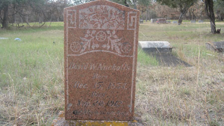 David W Nuckolls was born 15 Dec 1854 and died 20 Nov 1912. According to the 1910 U S Census he was born in Kentucky and was a boarder with the Granville Gourley family. He was single and worked as a peddler of poultry.